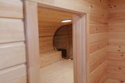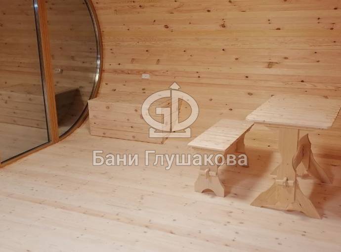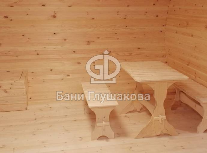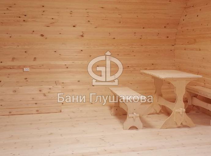 Строительство такой бани осуществляется на участке: сначала делается фундамент, затем собирается каркас, на который нанизываются хорошо просушенные доски. Изнутри стены обшиваются бессучковой вагонкой АB класса. К заказу доступна также отделка кедром.