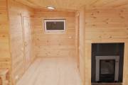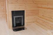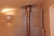 Печь устанавливается в парной, топка выносится в комнату отдыха, чтобы получился эффект камина. Установка шкафов, сундуков, встроенных скамеек — всё на усмотрение заказчика.