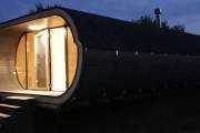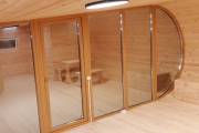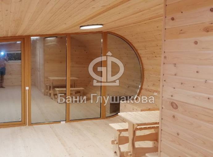 Особую прелесть этой бане придаёт остекление во всю площадь фасада. Стеклопакеты заказываются нами конкретно под этот проект. Всё герметично, без люфта и прочих недостатков.
