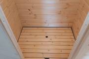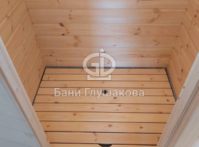 Установлен в помывочном отделении пластиковый герметичный поддон с сифоном для слива воды, в него вложен деревянный трапик (в планировках, где подразумевается душевое помещение). Ссылка на фото и видео