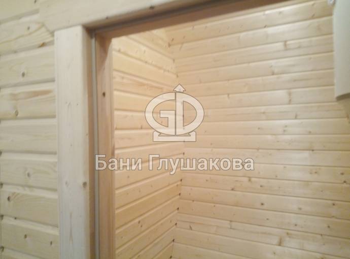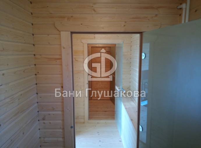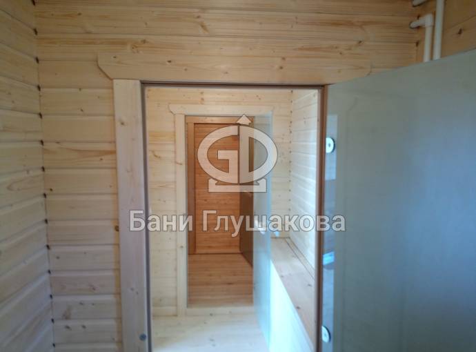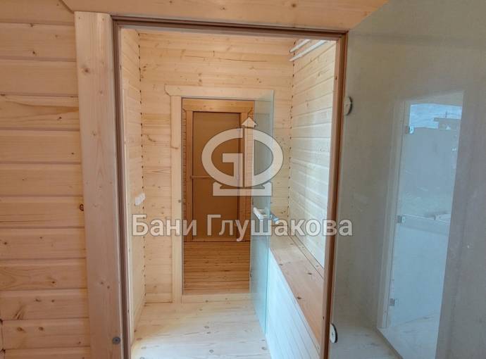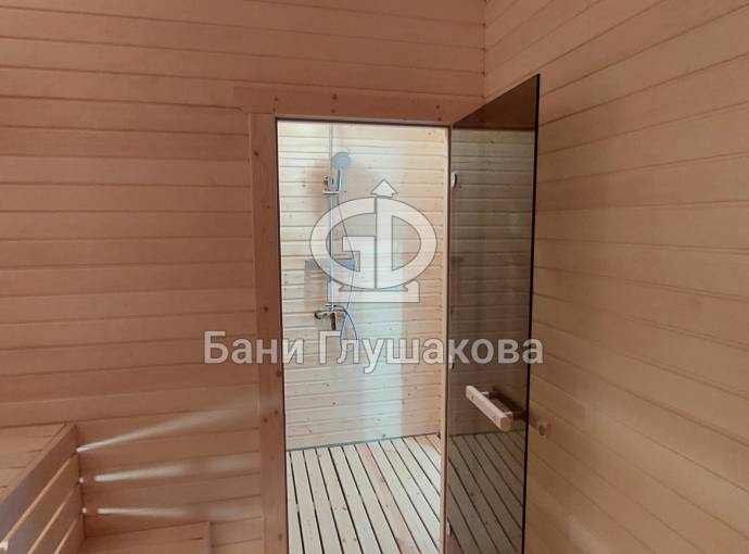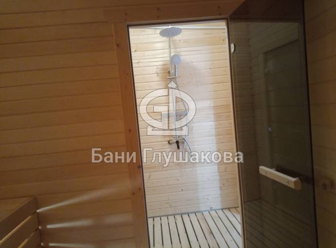 Размер бани 6 на 6 метров. Есть небольшая прихожая, комната отдыха, парная, душ, помещение для душевой системы, санузел.
