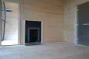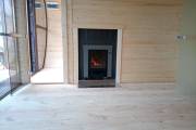 Если топка через стену то можно сделать красивые наличники из брашированной доски с полочкой на верху,
