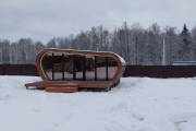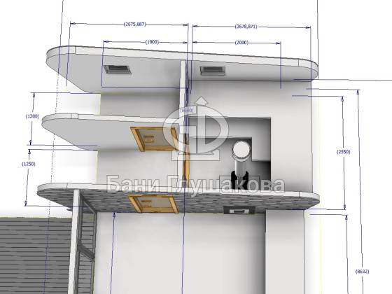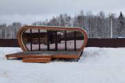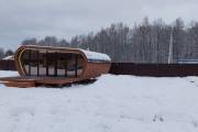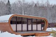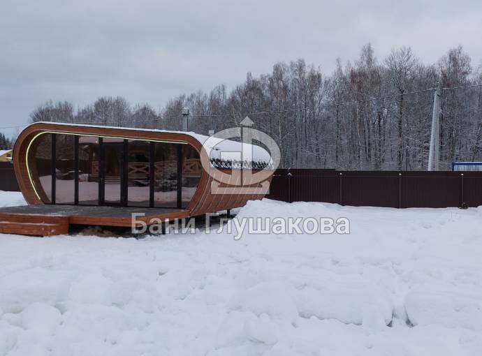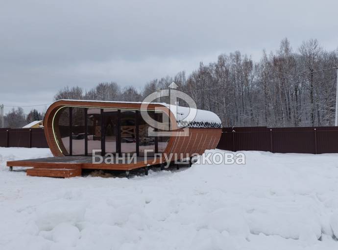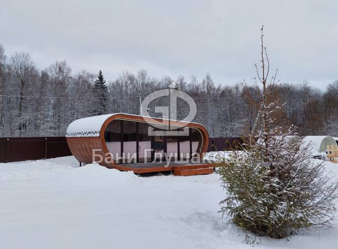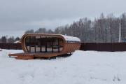 Обратите внимание на сложную форму этого объекта. Здесь нет ровных углов — и это сделано абсолютно намеренно, чтобы подчеркнуть нестандартность этой бани.