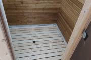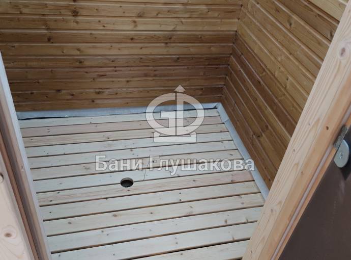 Установлен в помывочном отделении пластиковый герметичный поддон с сифоном для слива воды, в него вложен деревянный трапик (в планировках, где подразумевается душевое помещение). Ссылка на фото и видео