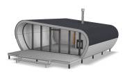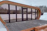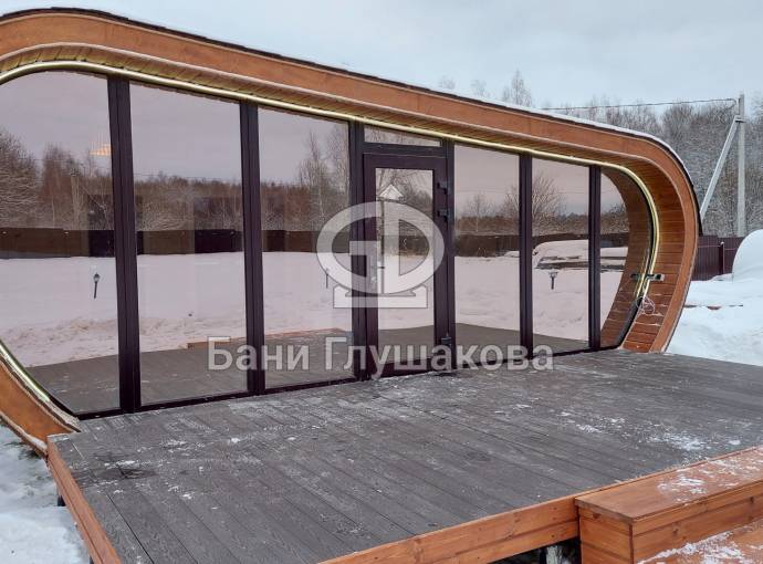 Особый шик проекту придаёт потрясающее панорамное остекление — стеклопакеты для линейки «Танк Армата» изготавливаются на заказ для каждой конкретной бани. Они идеально подходят по размерам, абсолютно герметичные и надёжные. Ставим качественные запорные механизмы и дорогую фурнитуру.