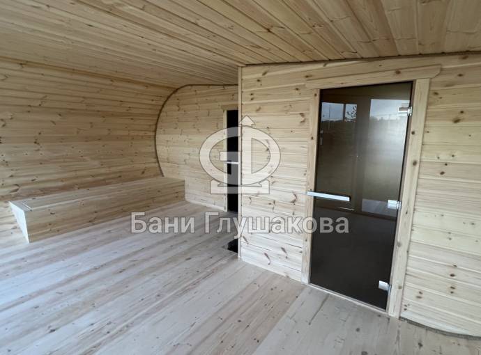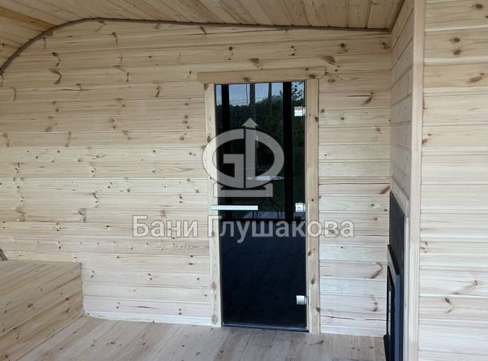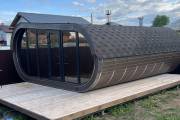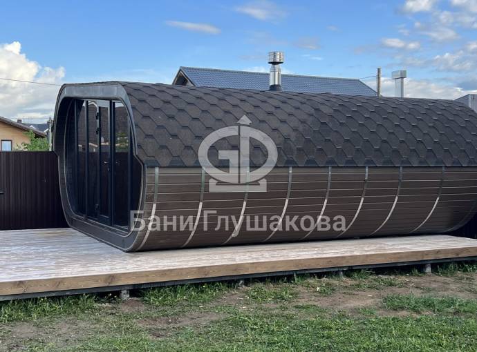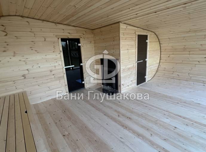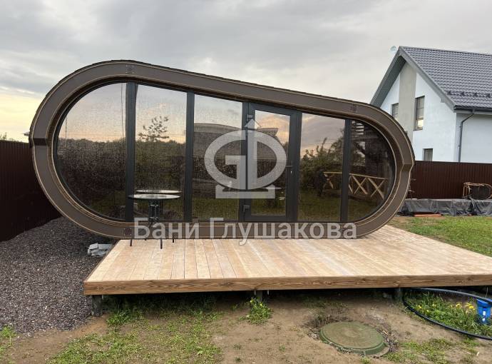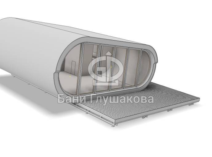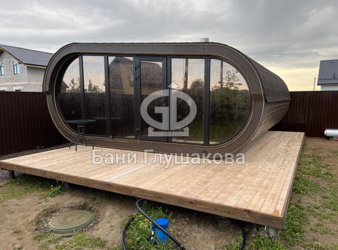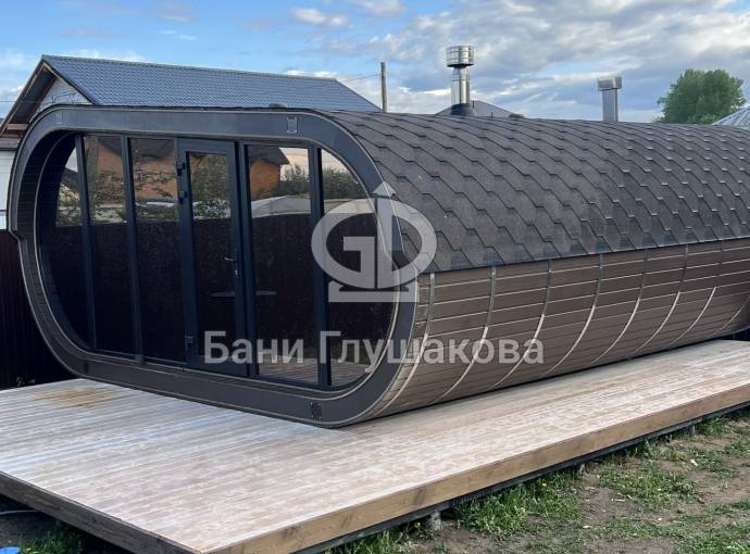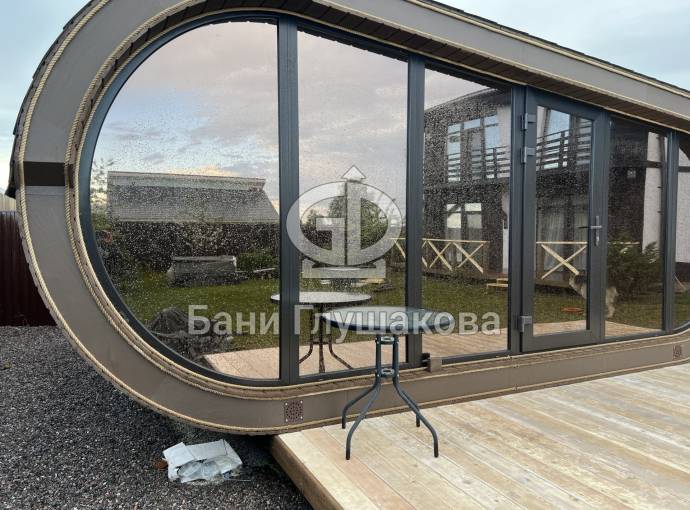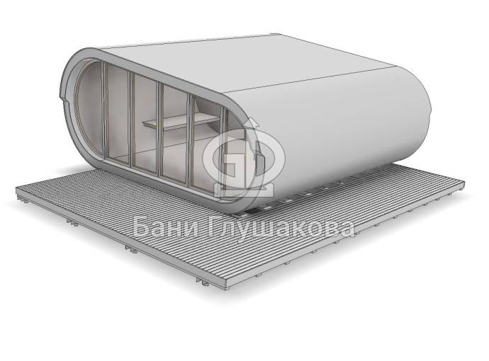 Проект запатентован. Изготавливается по сложной каркасной технологии с утеплением. Панорамное остекление заказывается на оконном заводе по индивидуальным размерам каждой бани.