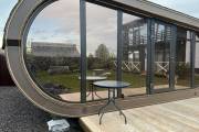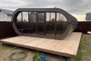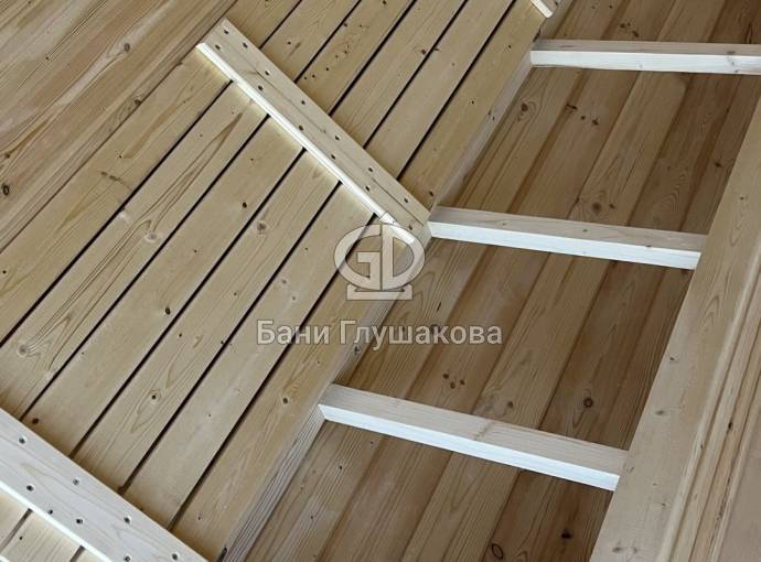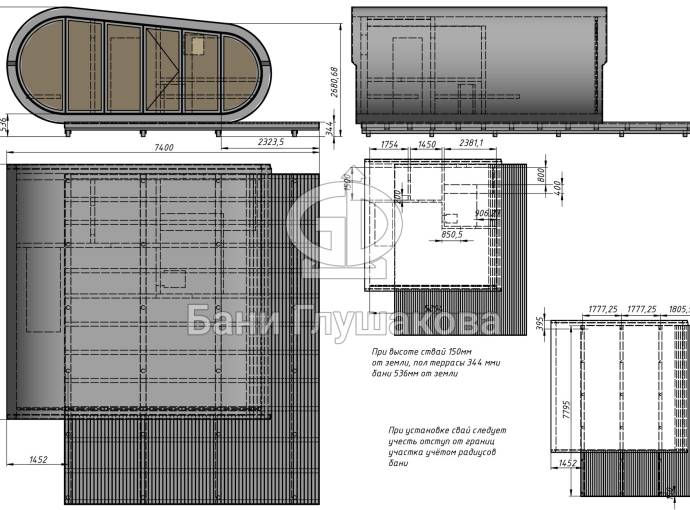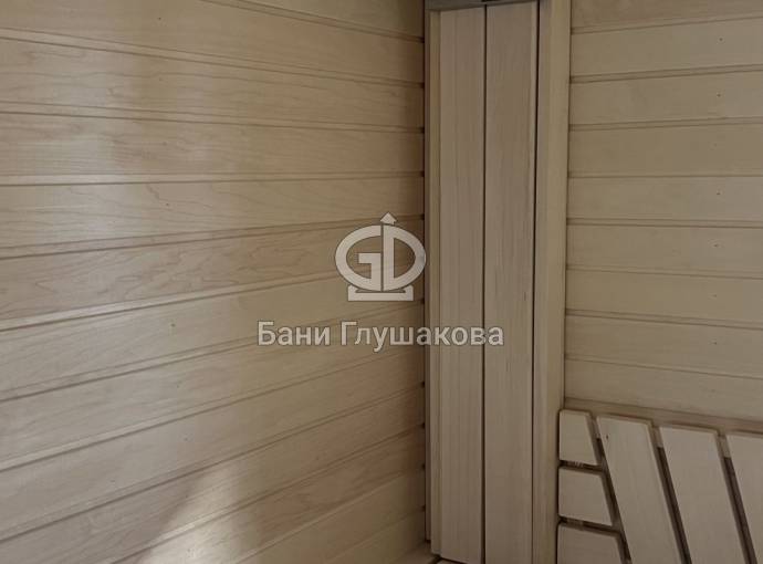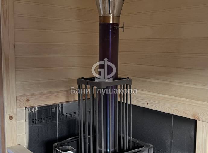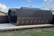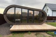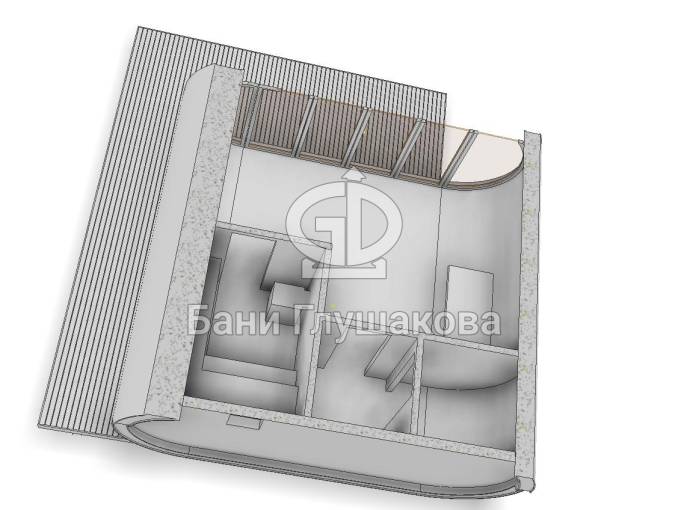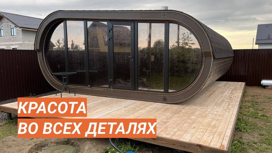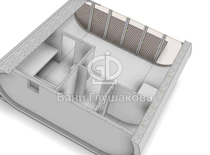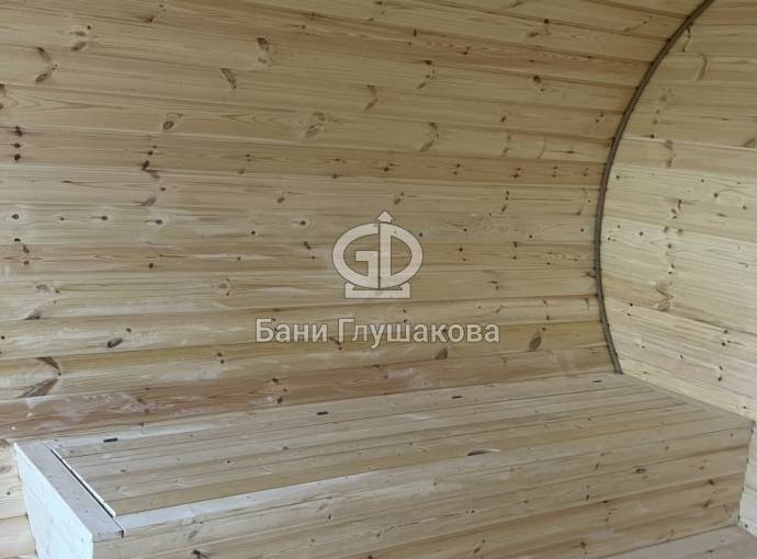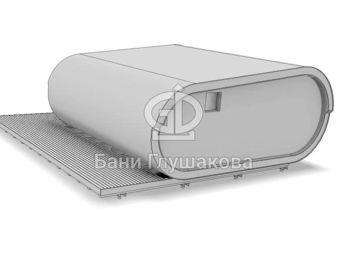 Проект запатентован. Изготавливается по сложной каркасной технологии с утеплением. Панорамное остекление заказывается на оконном заводе по индивидуальным размерам каждой бани.