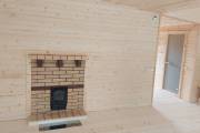 Если топка через стену то можно сделать красивые наличники из брашированной доски с полочкой на верху,
