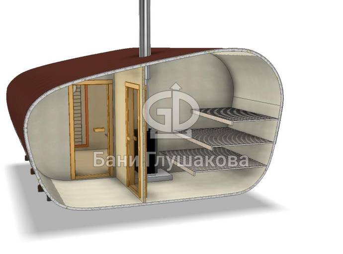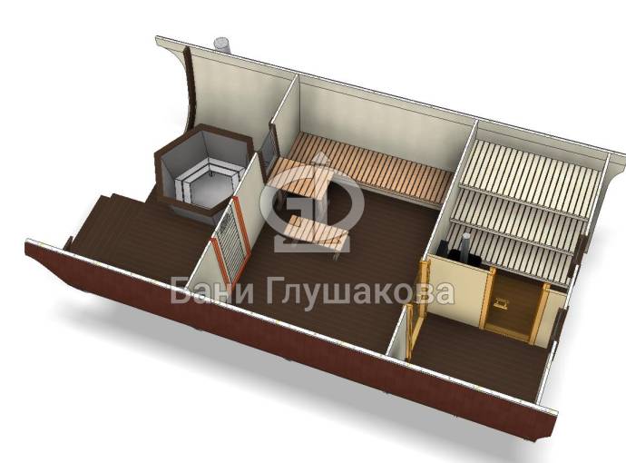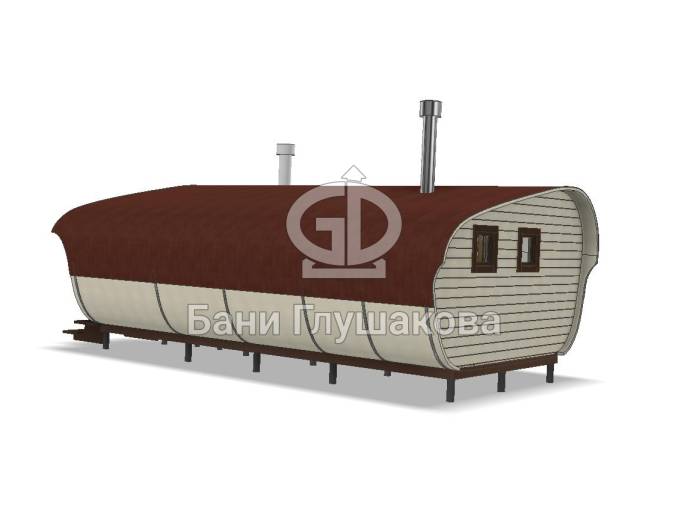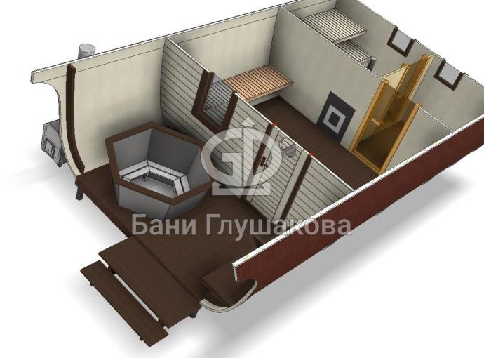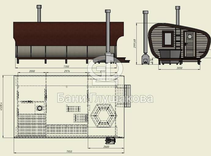 Этот проект – концепт. Это означает, что мы можем обговорить с вами все конструкционные моменты, поменять размеры, сделать индивидуальную планировку внутренних помещений. В этой бане можно воплотить все ваши пожелания, которые не противоречат законам физики.