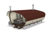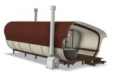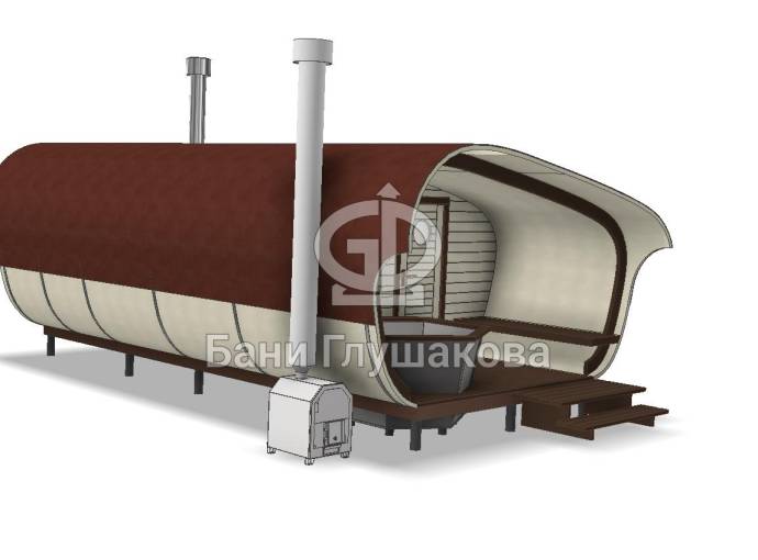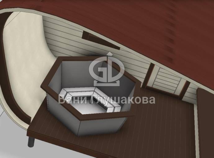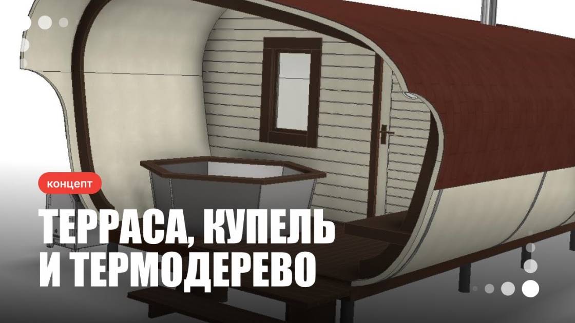 Разработали концепт новой бани «Танк» из бочковой термомодифицированной доски с большой террасой и встроенной купелью.