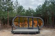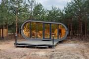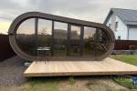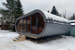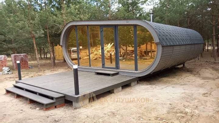Проект современной стильной бани «Танк» размером 6 на 7 с гостевой комнатой. Баня на фото собрана по каркасной технологии.