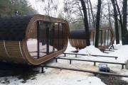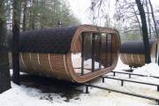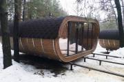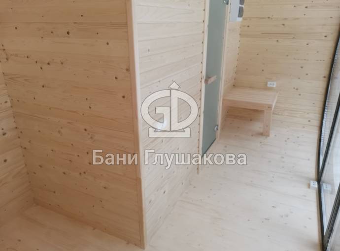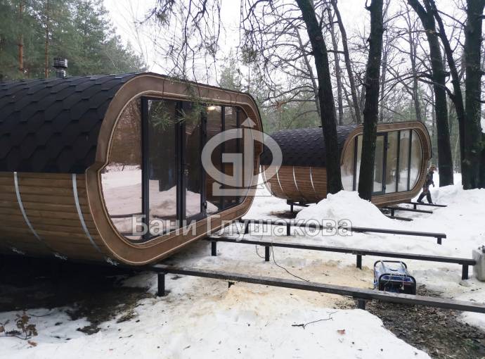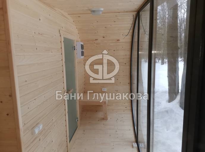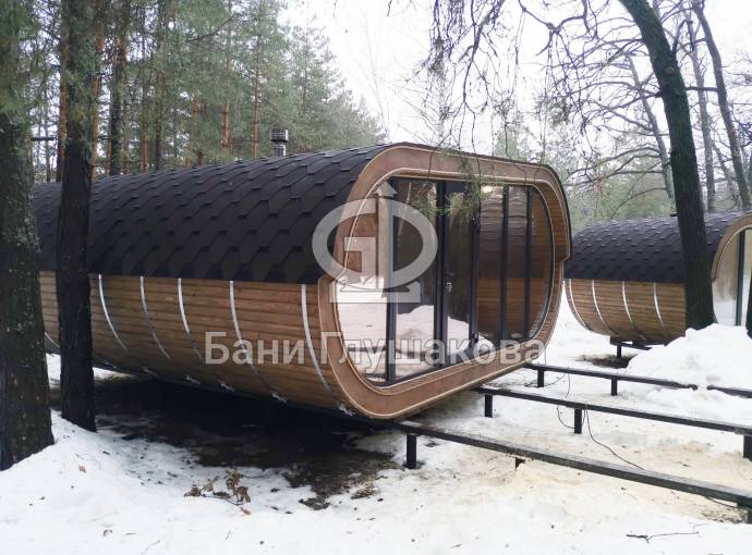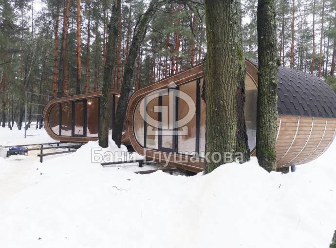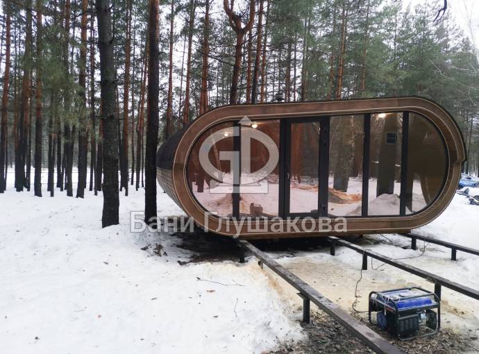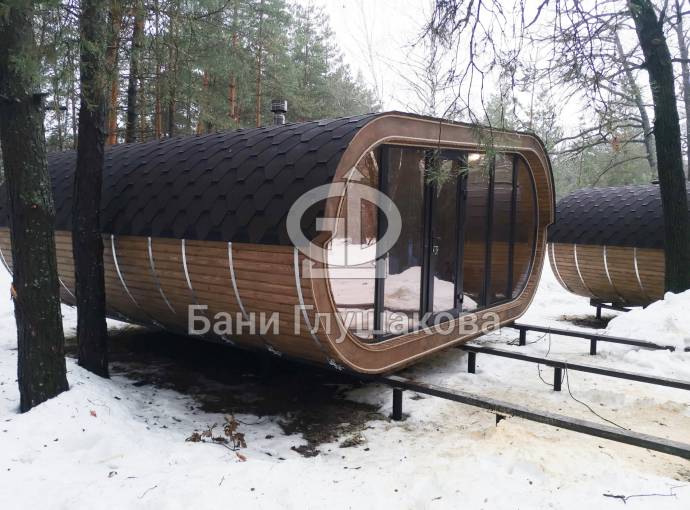 Создан на основе линейки элитных бань «Танк» с панорамным остеклением.