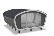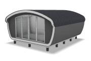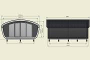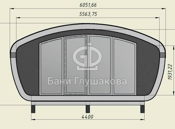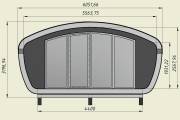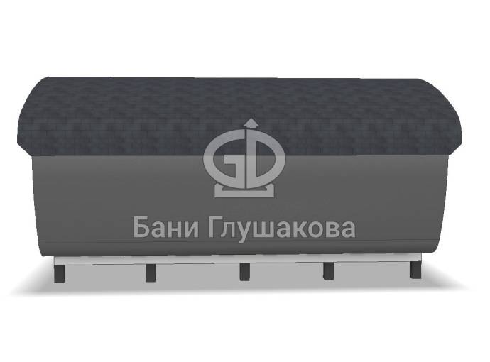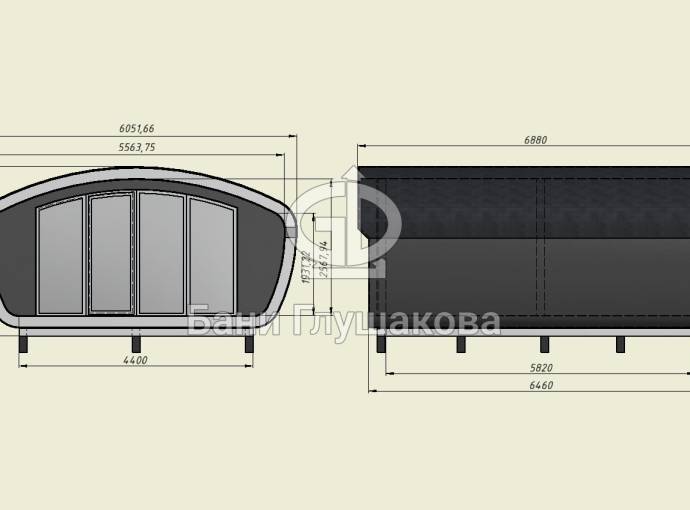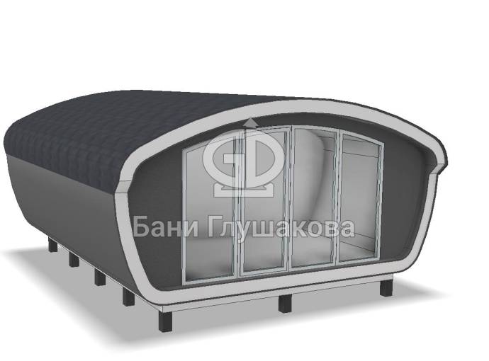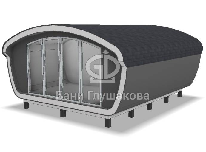 Создан на основе линейки элитных бань «Танк» с панорамным остеклением. Модель «Сказка» отличается особой округлой формой крыши и фасадного окна.