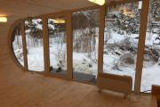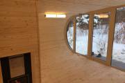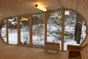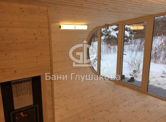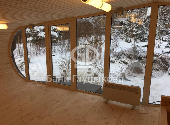 Часто спрашивают, насколько целесообразно ставить такие большие окна, мол, теплопотери же. Во-первых, стеклопакеты отличного качества и супер-герметичные; во-вторых, если за окном есть на что полюбоваться, то нужно ставить панорамные окна; в-третьих, баня не предназначена для постоянного проживания, а печи вполне хватает для обогрева комнаты.
