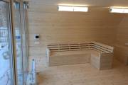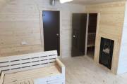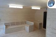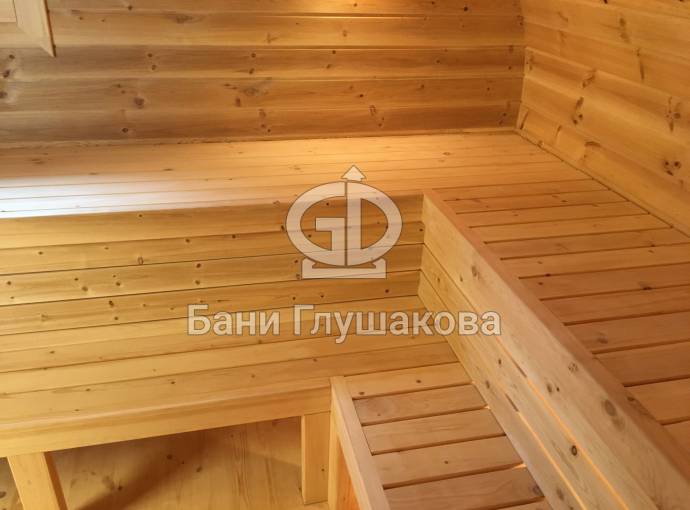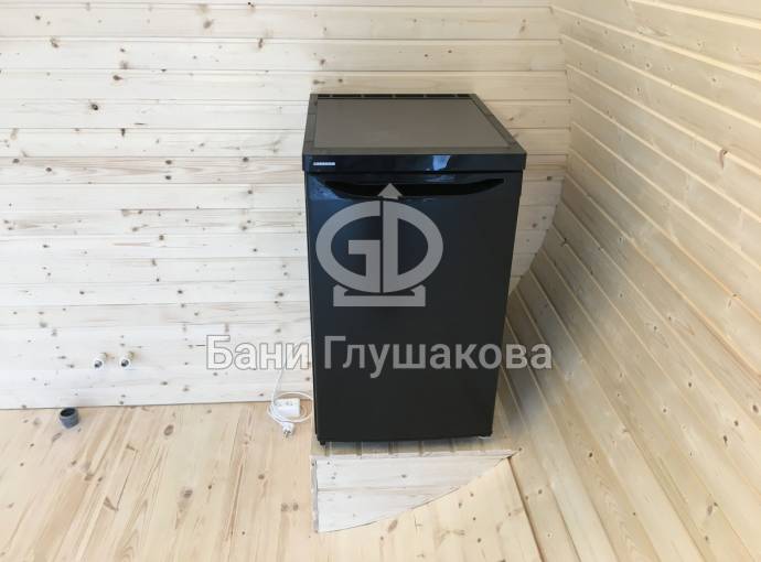 Примечания: в этом проекте (на фото и видео) парная обшита кедром — отсюда такой необычный цвет стен, в углу кухонной зоны установлен холодильник. Вокруг печи сделан защитный экран. По просьбе клиента в зоне отдыха установлено основание под диван с откидным верхом.