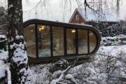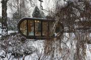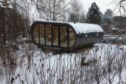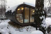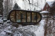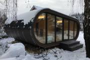 Это пример ультрасовременной бани, которая совмещает в себе сауну, душ, кухонную зону и комнату отдыха. Вполне может заменить собой дачу или стать гостевым домиком на вашем участке.