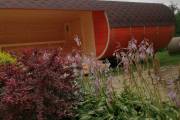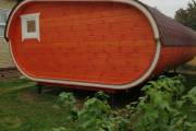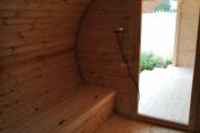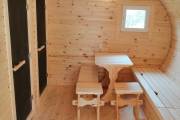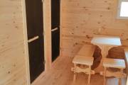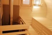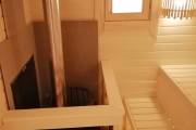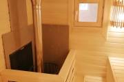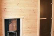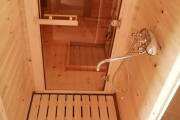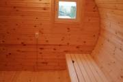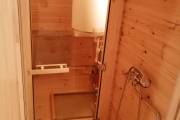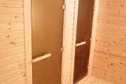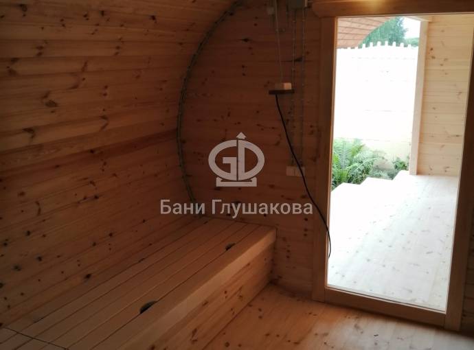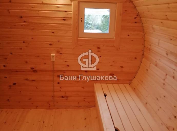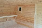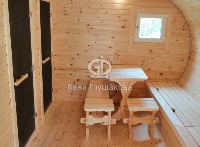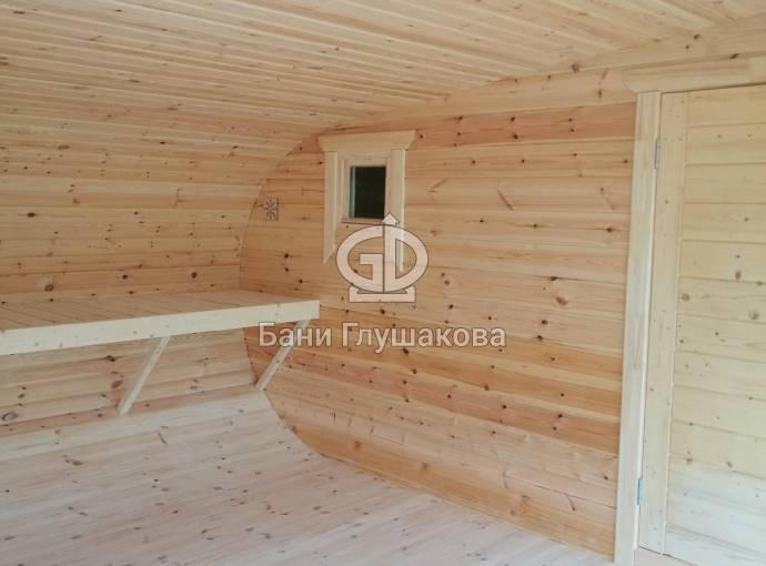 Внутри 4 помещения: просторная комната отдыха (сюда выведена топка печи с панорамным стеклом, поставлен комплект мебели, поставлены пластиковые стеклопакеты), парная (повешены абажуры, сделана подсветка нижнего полога, двухъярусные полки, обшита бессучковой осиновой вагонкой класса А, вентиляция, форточка, стеклянная матовая дверь), душевая (полностью готова к использованию, стеклянная матовая дверь), бойлерная (здесь спрятана душевая система и установлен поддон для сбора конденсата).