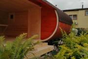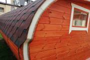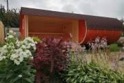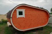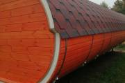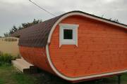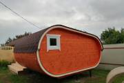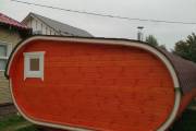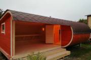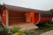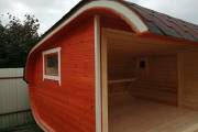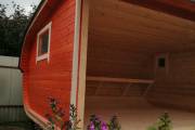 Новый спецзаказ, который вполне себе стал отдельным проектом. Это просторная каркасная баня с беседкой на основе проекта перевозной бани «Танк». Удлинив одну сторону бани, сделали закрытую террасу или беседку.