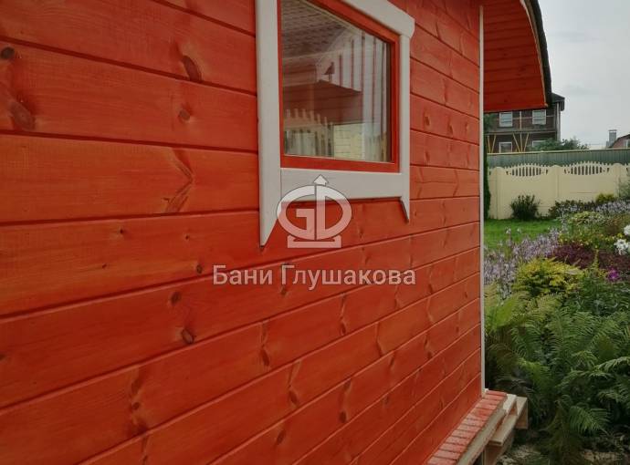 Баня каркасной сборки из сухой строганной доски — такая не деформируется, не трескается и сохраняет отличный вид долгие годы. Снаружи стены в 2 слоя покрашены антисептиком Биотекс Классик Универсал цвета «Рябина» (цвет можно выбрать абсолютно любой). Фундамент свайно-винтовой — понадобилось 14 свай и 12 м/п швеллера для обвязки. По цене обошлось в 60000 руб.