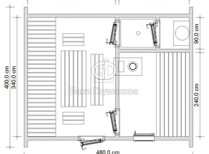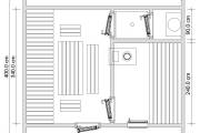 Стандартная планировка предполагает наличие парной (тут установлены двухуровневые полки и печь с каменкой); душевой кабины или моечного отделения — на выбор; комнаты отдыха с набором банной мебели. В комнату так же можно вывести выносную топку — так топить баню гораздо легче, да и грязи в парилке будет меньше.