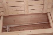 Установлен в помывочном отделении пластиковый герметичный поддон с сифоном для слива воды, в него вложен деревянный трапик (в планировках, где подразумевается душевое помещение). Ссылка на фото и видео