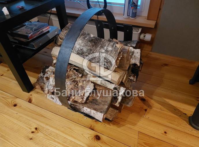 Декоративная комнатная дровница для поленьев изготовлена в виде спирали из нержавеющей стали. Довольно большая и увесистая: легко помещаются две-три охапки дров.