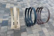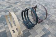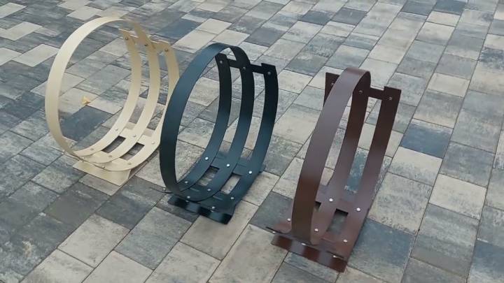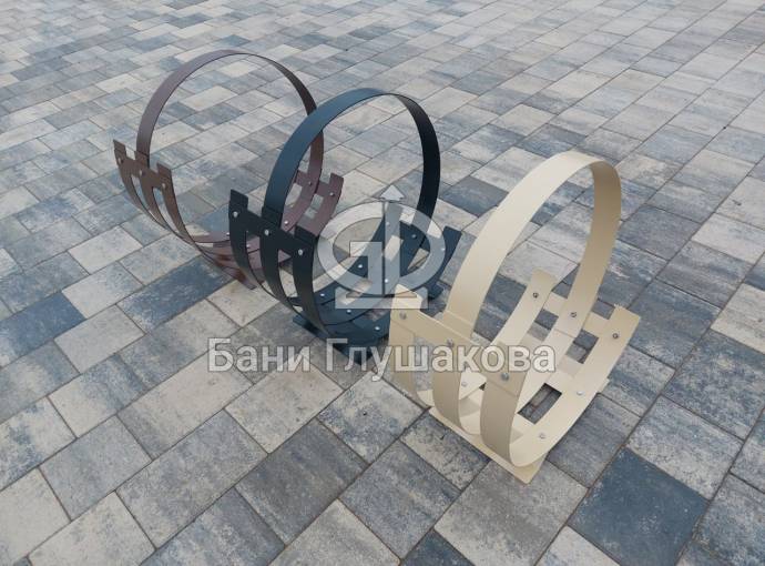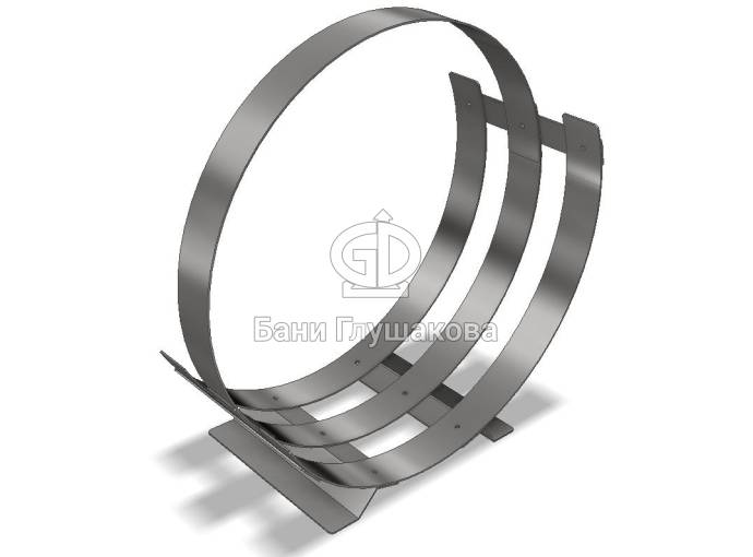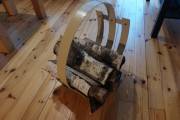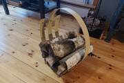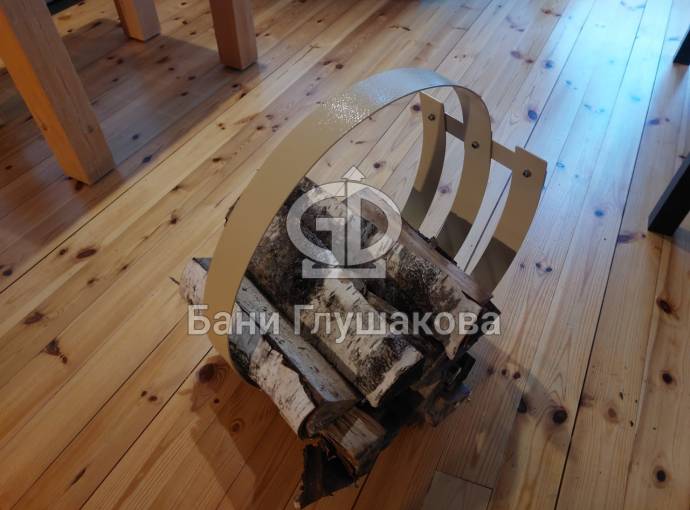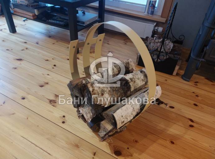 Декоративная комнатная дровница для поленьев изготовлена в виде спирали из нержавеющей стали. Довольно большая и увесистая: легко помещаются две-три охапки дров.