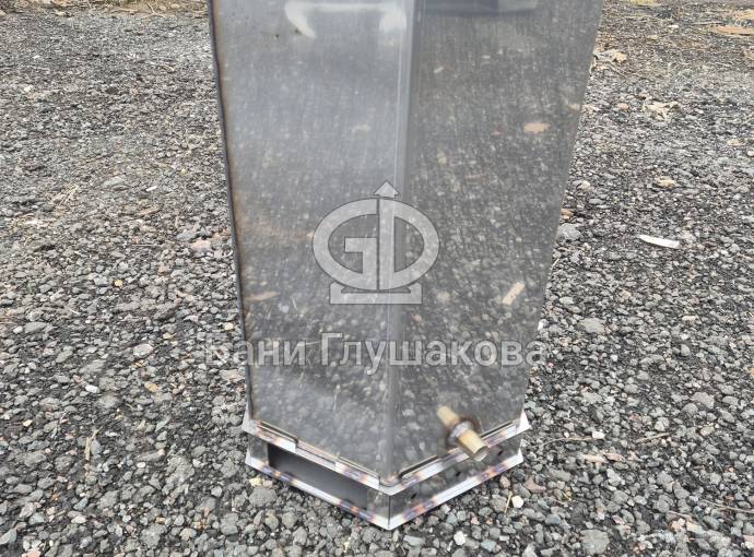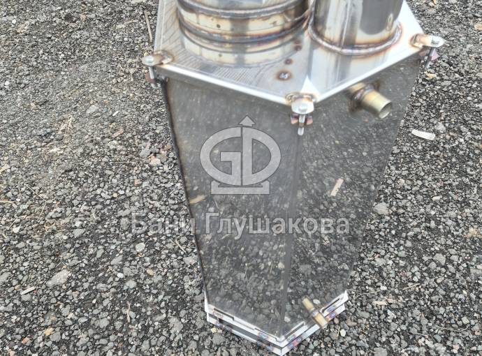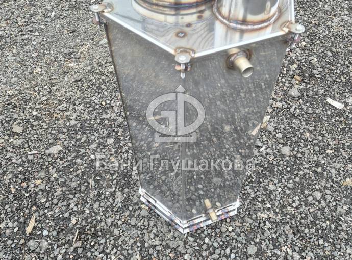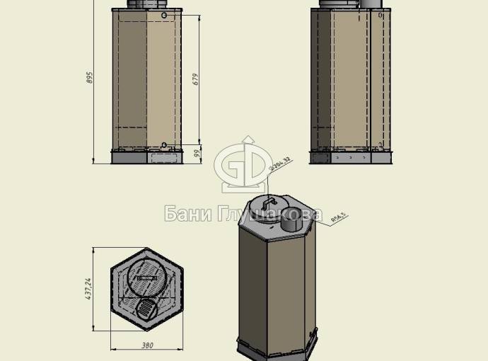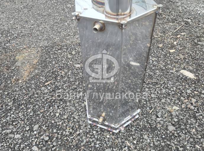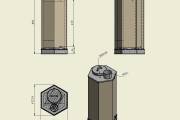 Печь для бассейна представляет собой высокий шестигранный цилиндр с топкой, зольником и трубой. Топливо – дрова и топливные брикеты.