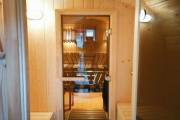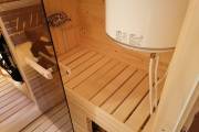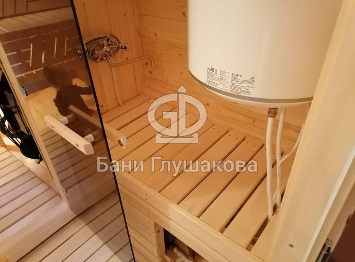 Можно установить насосную станцию, бойлер, бак, душ, устанавливается как в душевой комнате так и в маленькой бане, но уже слева или с права в комнате отдыха, а душ выводится в этом случае в парную.