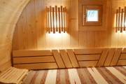 Благодаря увеличенному диаметру этой бани (стандартные круглые бани имеют диаметр 2,1 метр) мы можем сделать очень удобную парную с двухуровневыми пологами у задней стены, а печь поставить сбоку от двери. Красивая декоративная спинка полога, удлинённый нижний ярус, симпатичные абажуры — всё это уже стало практически обязательными атрибутами наших бань.