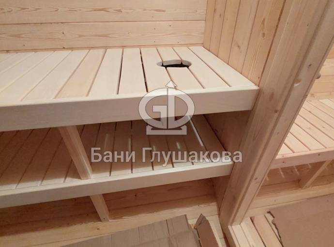 В комнате отдыха по середине скамейки или у стены, если маленький предбанник