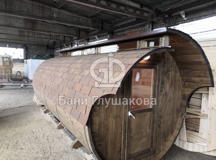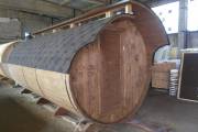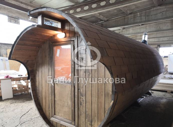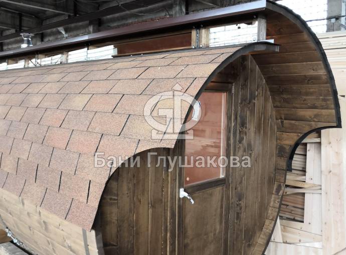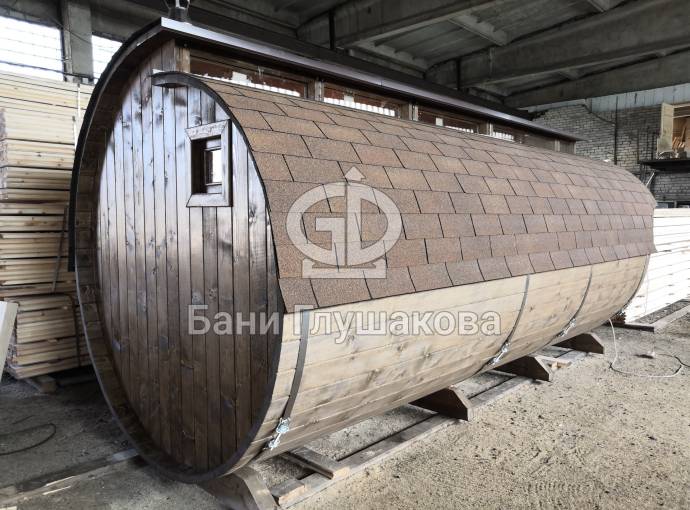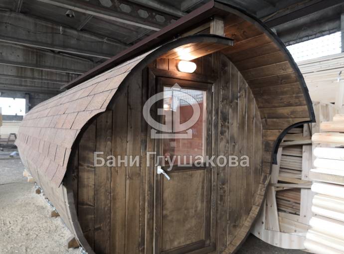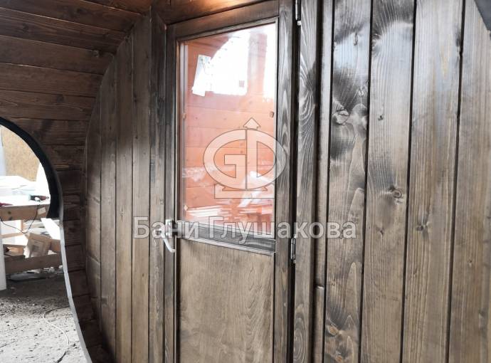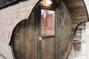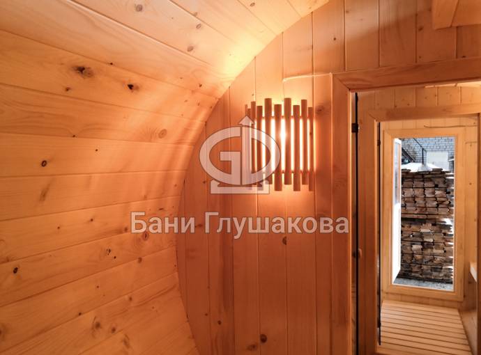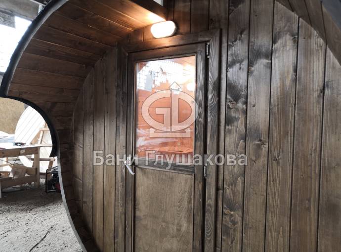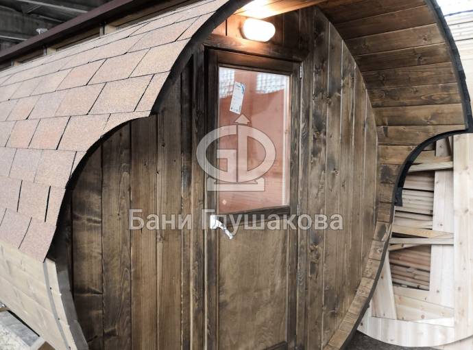 На фотографиях «Улитка» собрана из специально состаренной брашированной доски, однако от этой опции можно отказаться и заказать баню, например, из кедра. Цвет также остается на усмотрение клиента. Мы покрасим вашу баню бочку в любой цвет.