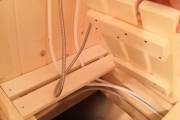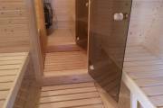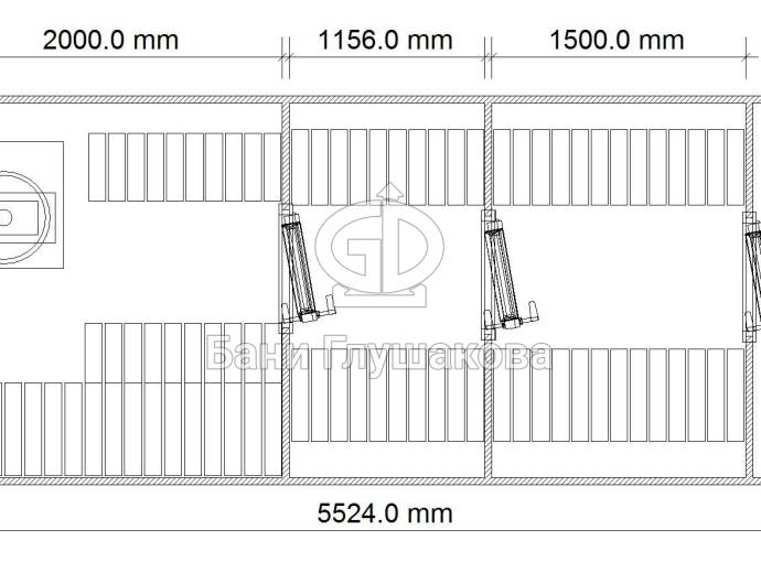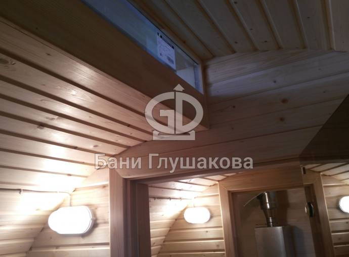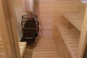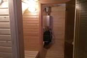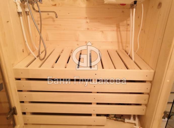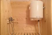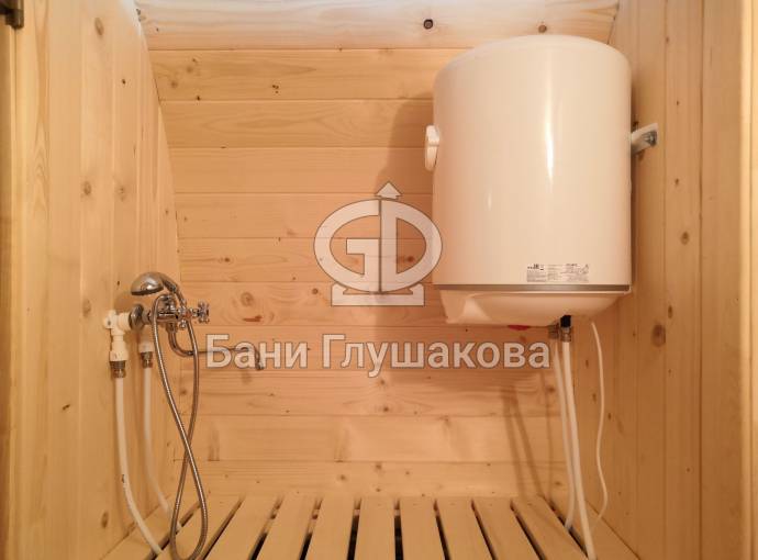 Можно установить насосную станцию, бойлер, бак, душ, устанавливается как в душевой комнате так и в маленькой бане, но уже слева или с права в комнате отдыха, а душ выводится в этом случае в парную.