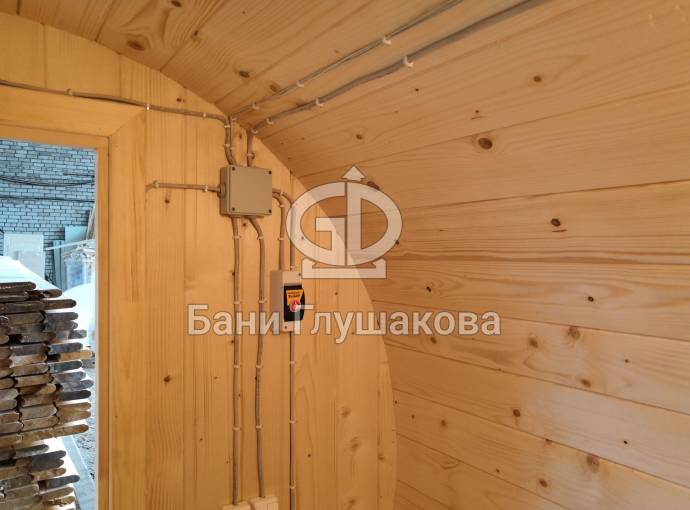 Входит в стоимость. Включает светильники в каждом помещении, вводный автомат, негорючий провод в парную, розетка в комнате отдыха (в банях-бочках розетка устанавливается по требованию).