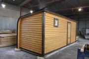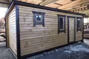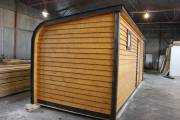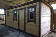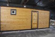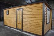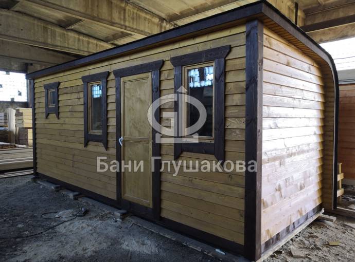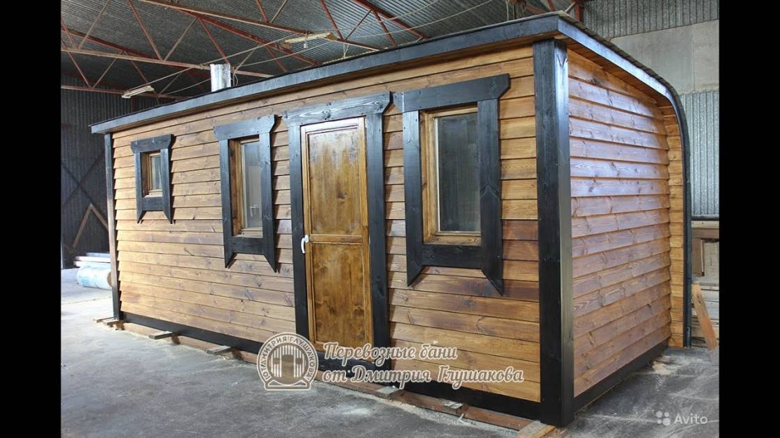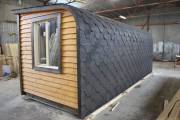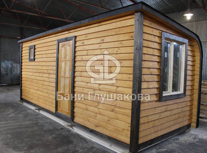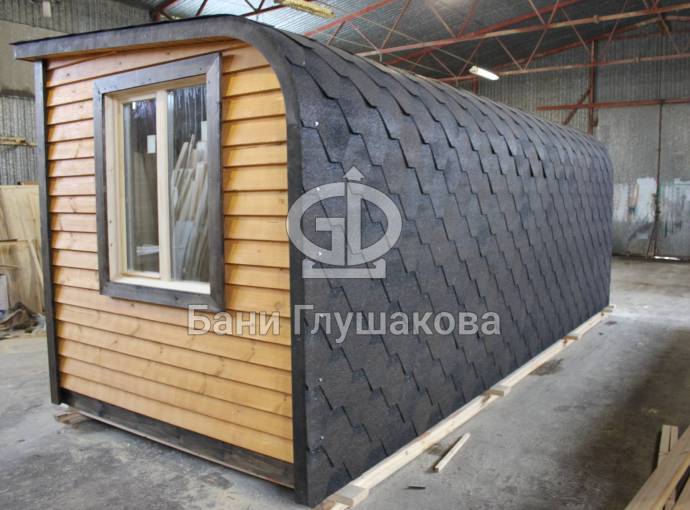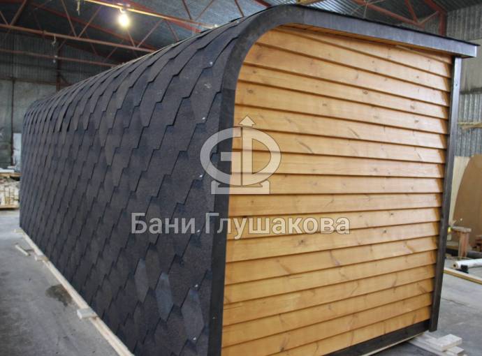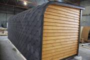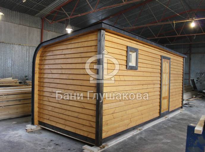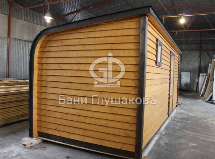 Перевозная баня «Клин» — старшая модель из линейки закругленных бань. Она имеет самый большой размер (максимально допустимый для мобильных сооружений) 6х2,2 м. В остальном она ничем не отличается от своих сестер — та же оригинальная закругленная кровля, плавно переходящая в стену; каркасная сборка из досочек внахлест; полная отделка под ключ.
