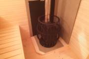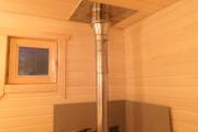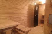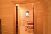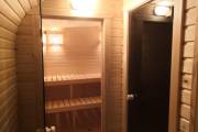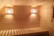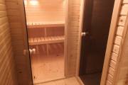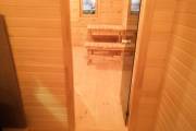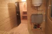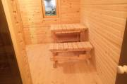 Сауна сделана по-современному красивой: двухуровневые пологи, декоративная подсветка снизу и сверху, форточка, установлена аккуратная печь-каменка. Есть душ, который работает от душевой системы (бойлер, насос, бак для воды, смеситель, лейка). Внутри установлены стеклянные двери.
