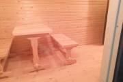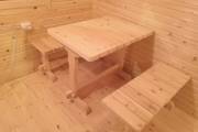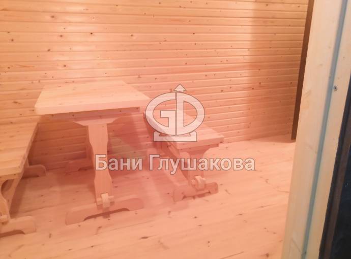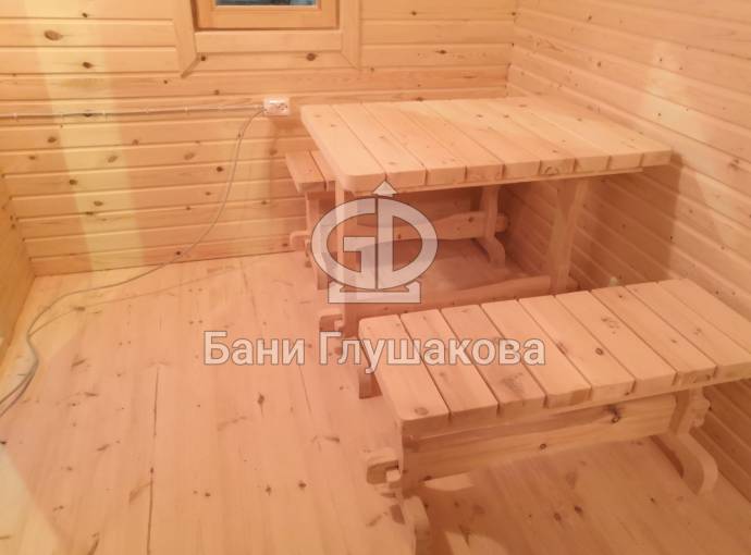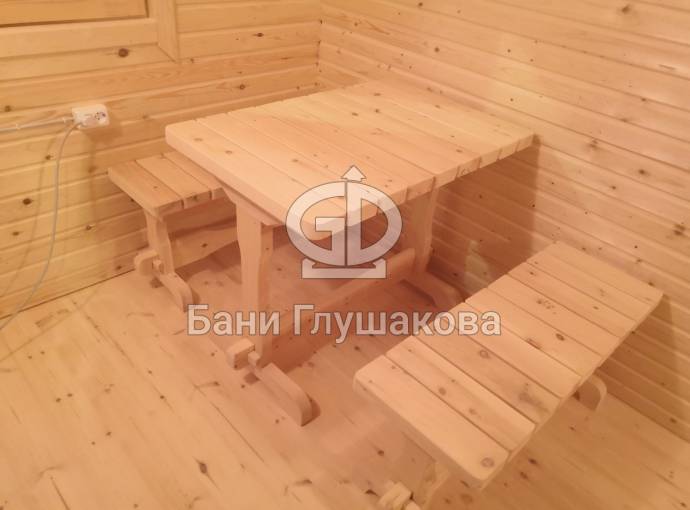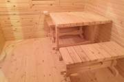 В комнате отдыха комплект деревянной мебели для бани.