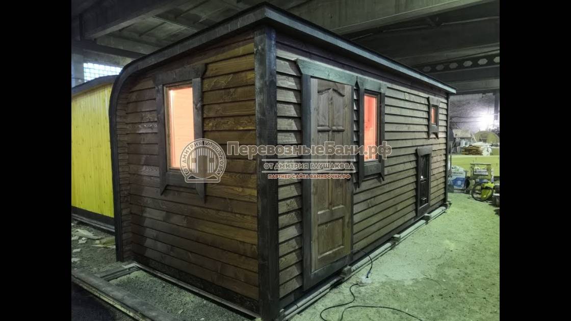 Перед вами проект мобильной каркасной бани по проекту «Красногорск» из очень популярной закругленной линейки. Размер самый большой для готовой бани — 6 метров. Снаружи обшита покрашенной сухой доской внахлест (американкой). Внутри обшивка из хвойной (комната отдыха, душевая) и осиновой (сауна) вагонки.