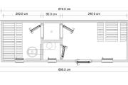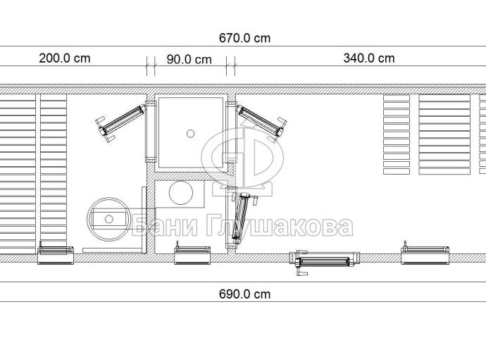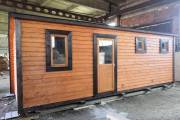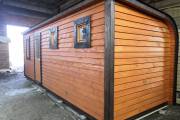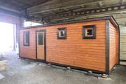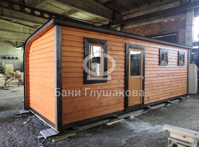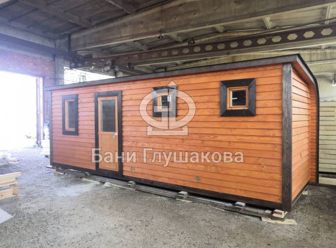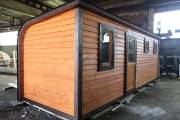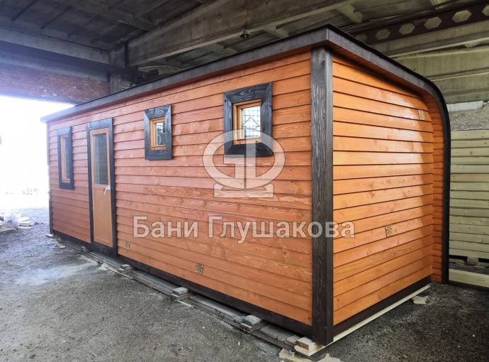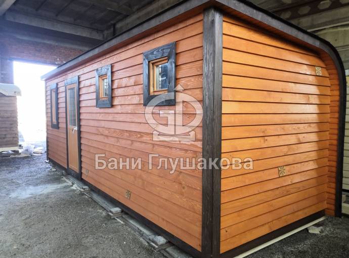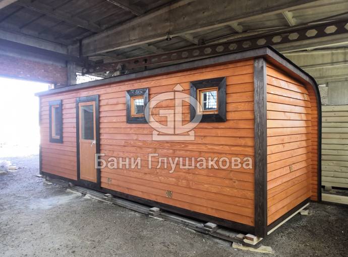 Это спецзаказ - готовая перевозная баня закругленного типа 7 метров длиной. Сделана индивидуальная планировка по чертежам клиента: большая комната отдыха, парная, душевая комната и отдельно топочная.