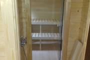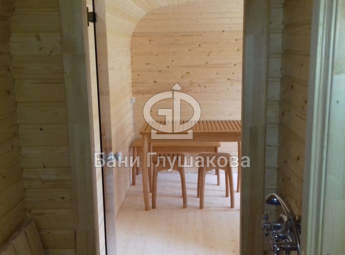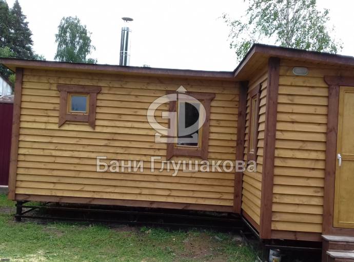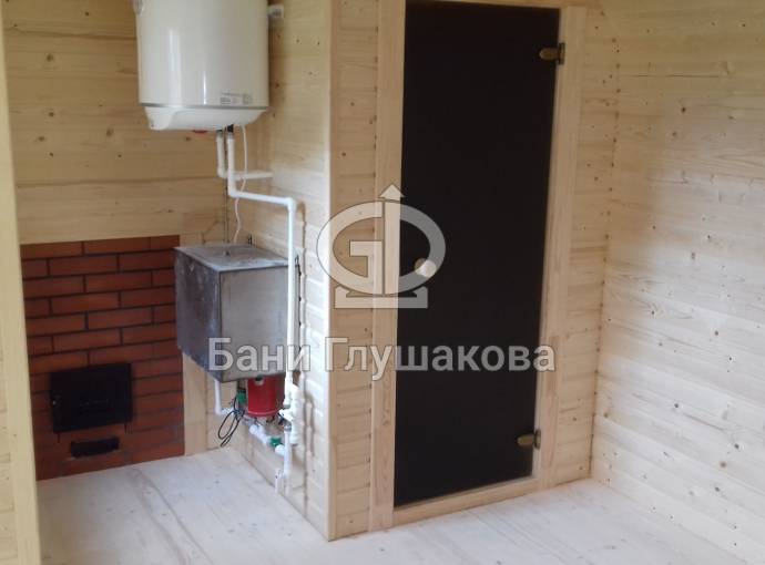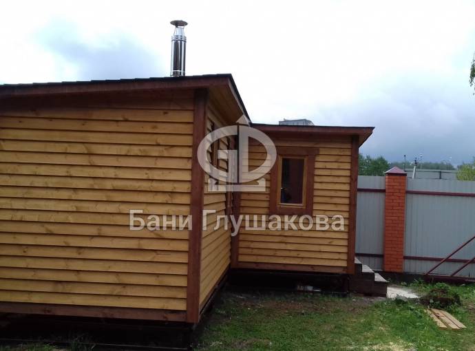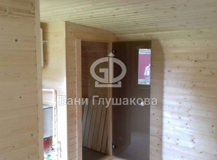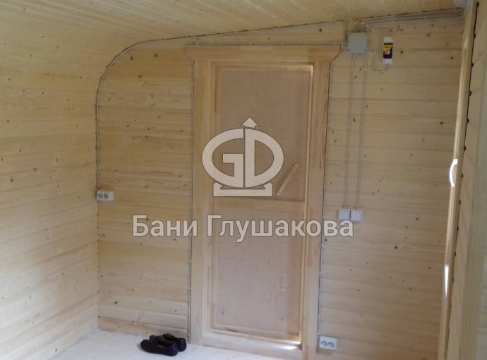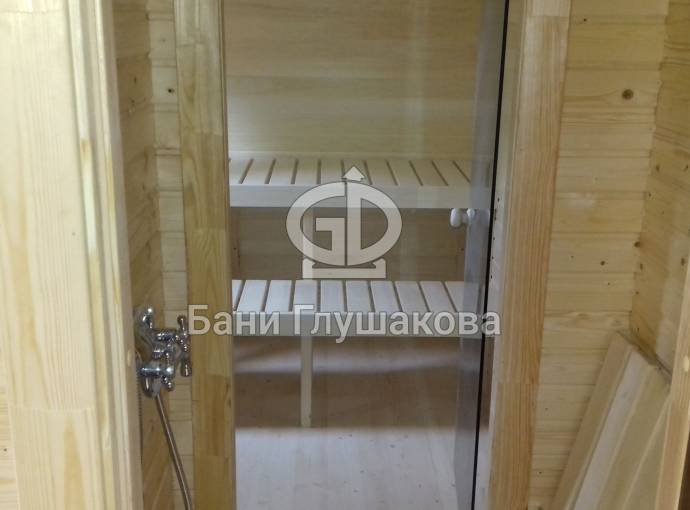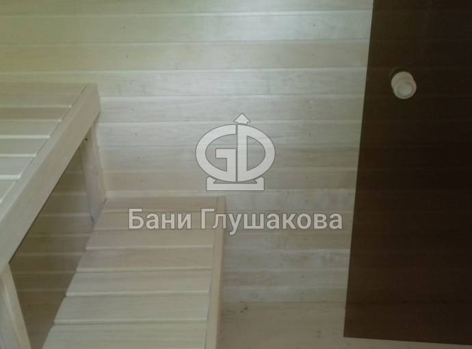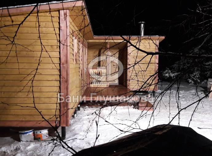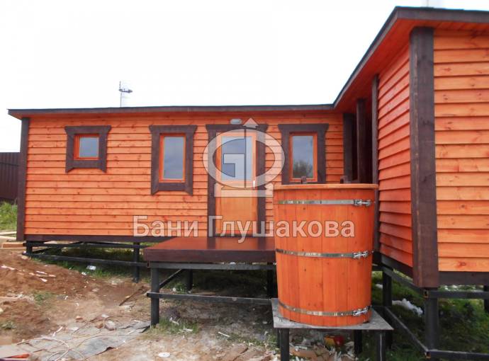 Баня, представленная на фотографиях, установлена на свайно-винтовой фундамент (наша работа!). Выполнена полностью под ключ: внешняя покраска, обшивка вагонкой изнутри, установка окон и дверей (снаружи поставлена очень хорошая деревянная дверь нашего производства, внутри - стеклянная), электропроводка с освещением, пологи, печное и душевое оборудование, трапики, комплект фабричной мебели. В общем, все в лучших традициях Дмитрия Глушакова.