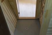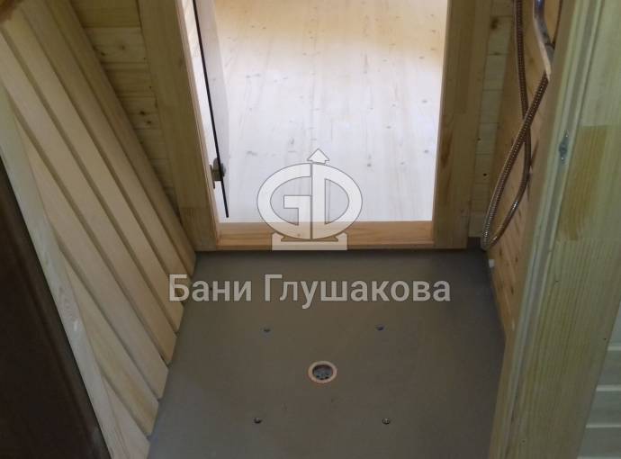 Установлен в помывочном отделении пластиковый герметичный поддон с сифоном для слива воды, в него вложен деревянный трапик (в планировках, где подразумевается душевое помещение). Ссылка на фото и видео