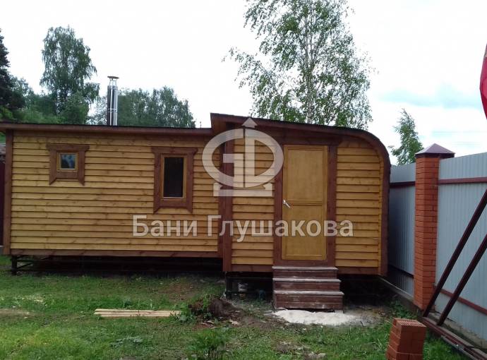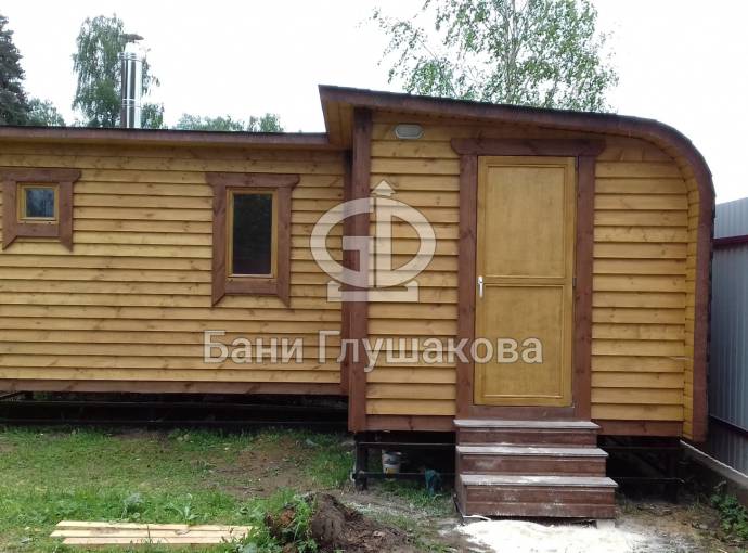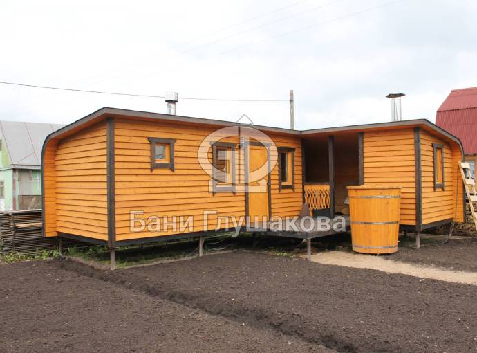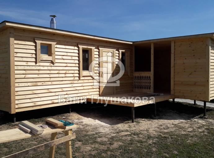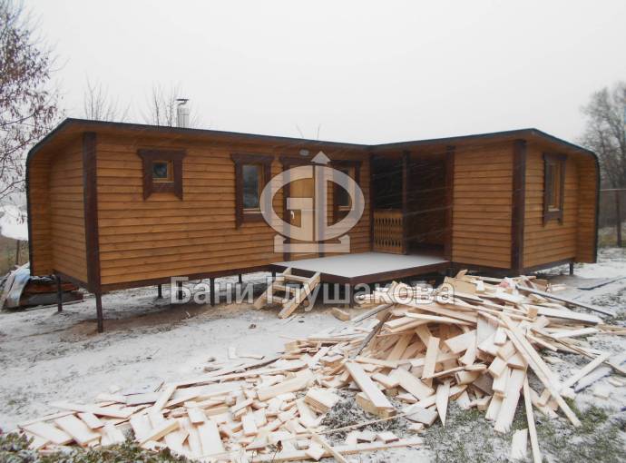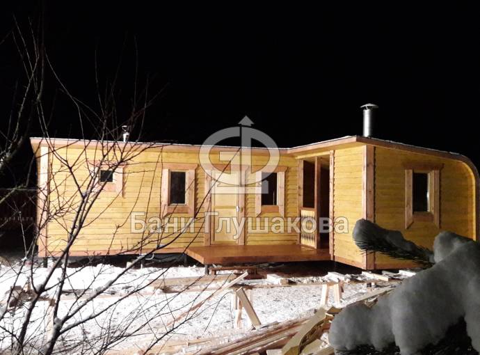 Обращаем ваше внимание, что это стационарная баня. Строительство происходит непосредственно на участке клиента — из-за размеров доставка в готовом виде невозможна.