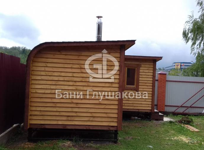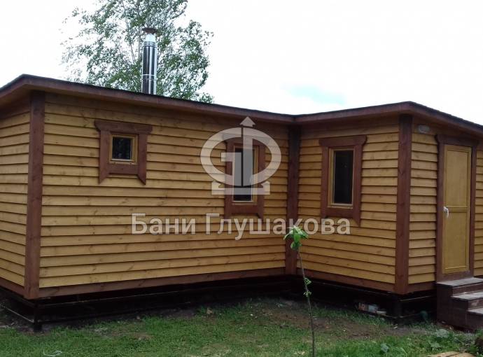 Это первый заказ на угловую баню каркасной сборки в уменьшенном размере. Малышку так и назвали — «Мини». Размер 4х6 и площадь почти 20 квадратов (к слову, старшая сестричка имеет площадь почти 30 кв.м.). Проект выполнен на основе линейки закругленных бань. Сборка по запатентованной технологии из сухой доски внахлест — ни одна компания не предложит вам такой оригинальный вариант.