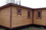 Сухая, строганная, покрашенная и только потом установленная доска внахлест одна на другую, (если это баня «Барн», то обшивается имитацией бруса), если баня «Кубота», то планкеном.