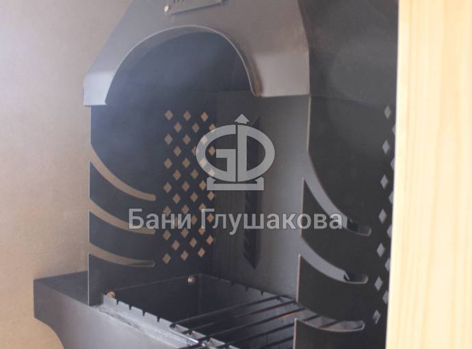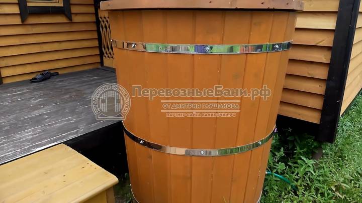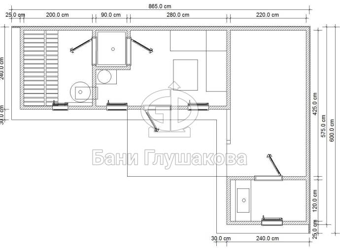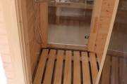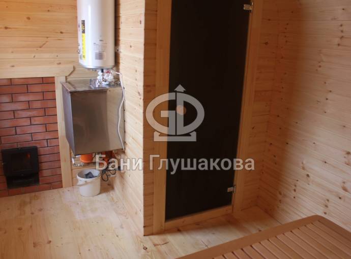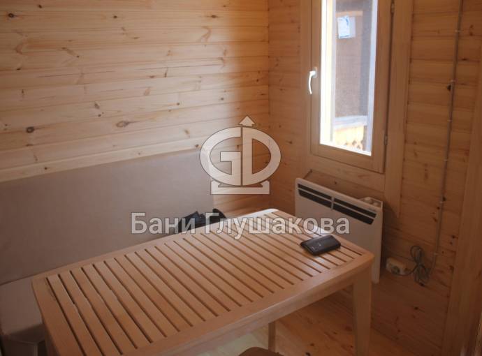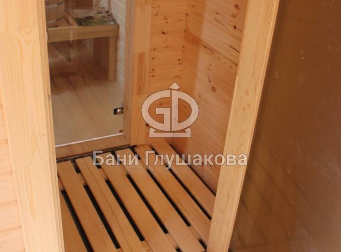 Угловое расположение бани позволяет установить на входе площадку-подиум — обычно тут ставят купель для купания после парилки. К слову, у нас можно выбрать и сразу заказать установку купели с подогревом. Сделаем хорошую скидку!