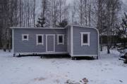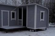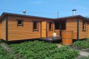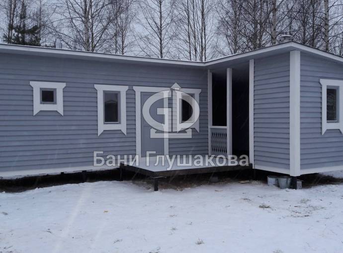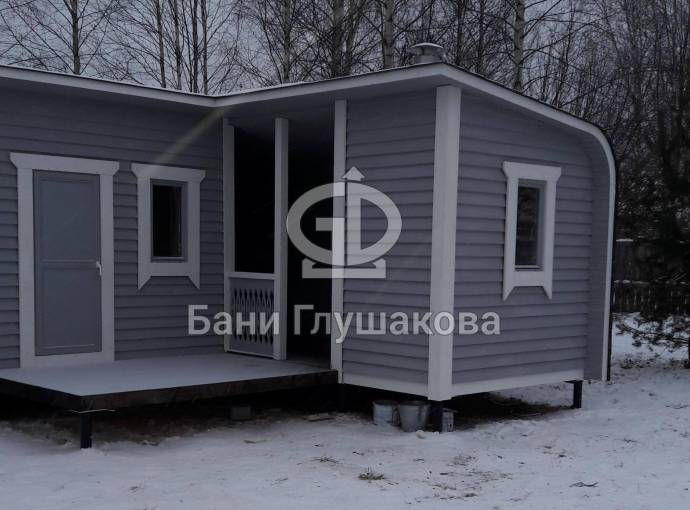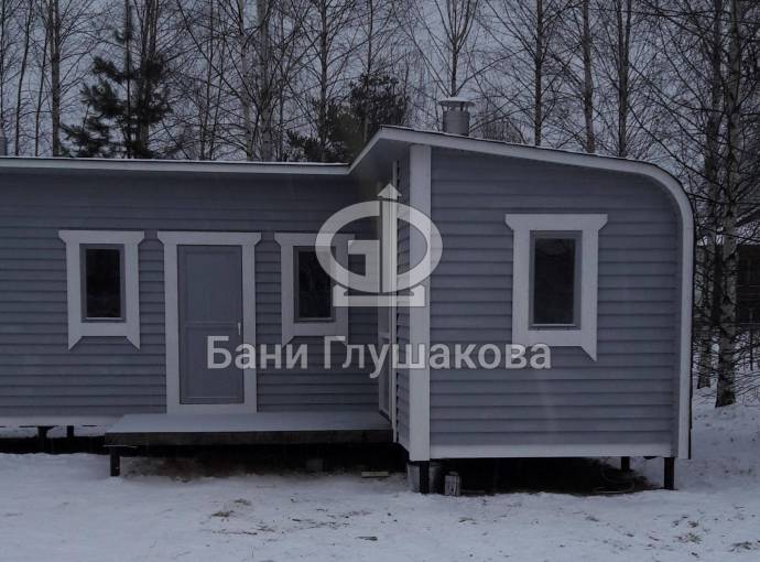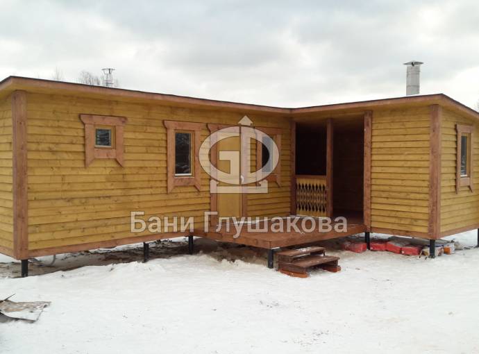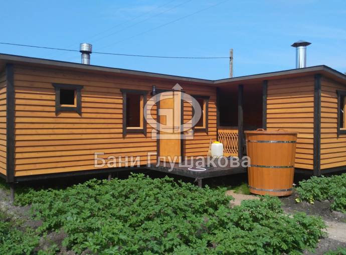 Угловая баня на фотографиях построена по образцу закругленных каркасных бань. Состоит из двух частей с отдельными входами — одна из них является непосредственно баней, во второй обычно устраивают летнюю кухню, беседку, туалет, подсобное помещение — в зависимости от предпочтений владельца.