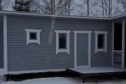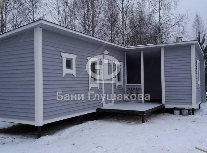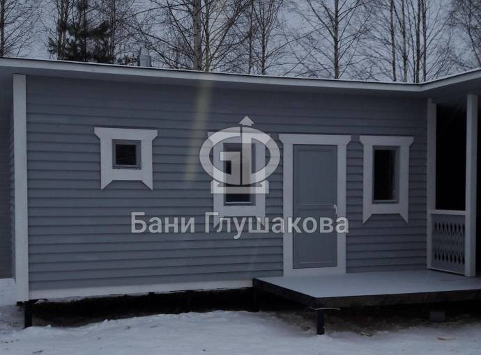 Баня собрана по каркасной технологии. Снаружи стены покрашены великолепным серым цветом в финском стиле, обводка сделана белым цветом — результат впечатляет. Лаконичный дизайн в совокупности с функциональностью делает этот проект просто фантастическим.