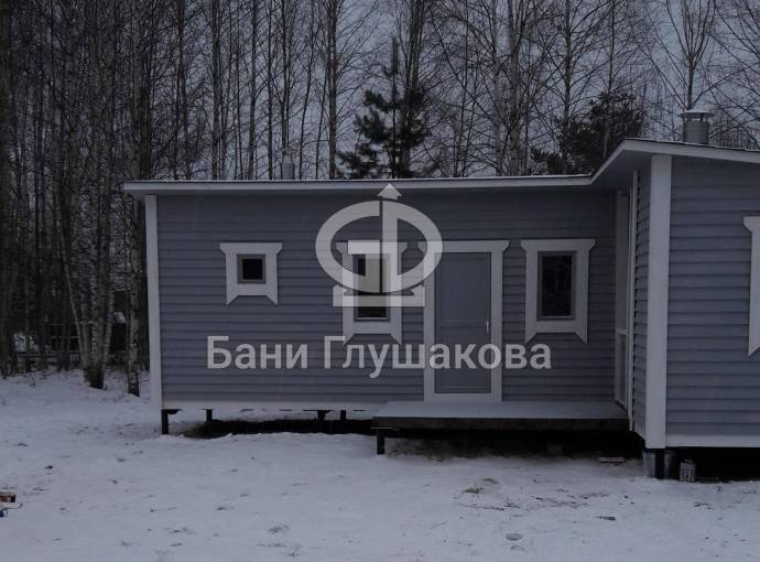 Сборка осуществляется на участке клиента. Рекомендуем ставить эту баню на свайно-винтовой фундамент — это идеальный вариант. Строительство занимает примерно 10-14 дней в зависимости от погодных условий. Полная внутренняя отделка с установкой печи, душа, электропроводки включена в стоимость.
