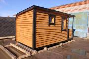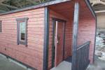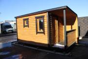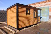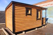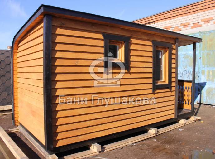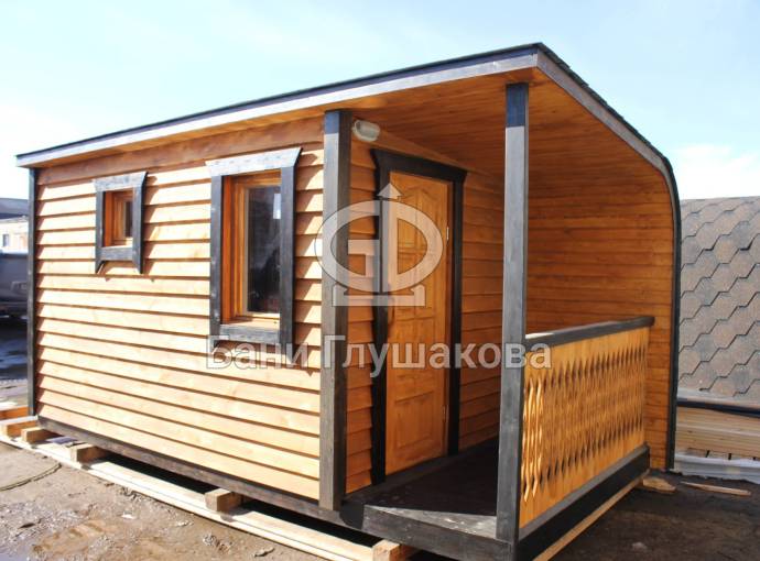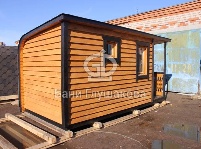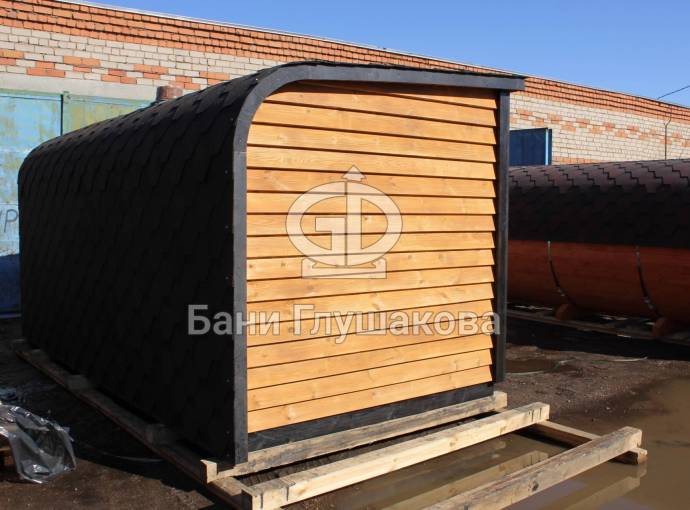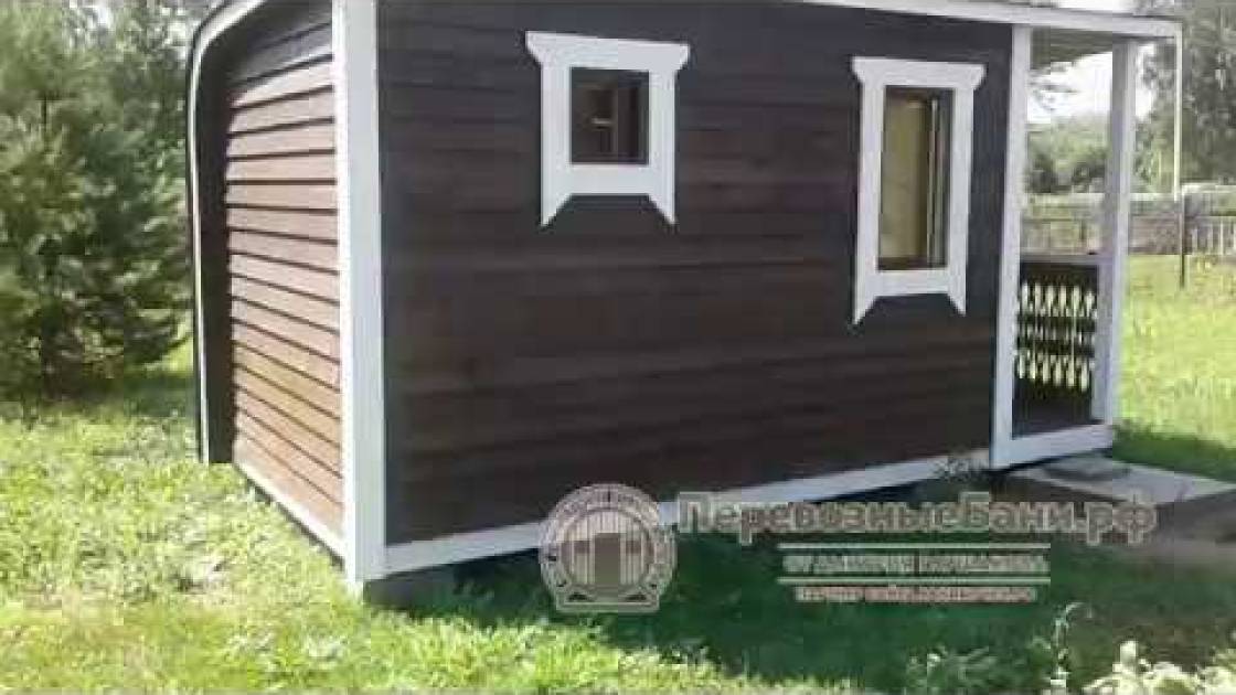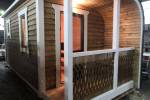 Когда мы работали над линейкой закругленных бань, нашей целью было показать, что перевозные бани — это не постройки в виде бытовки из Пестово. Добавить чуточку воображения, чувство эстетики, добротные материалы и золотые руки — и получается чудесная готовая перевозная баня «Тверь» с резной террасой, оригинальной закругленной крышей и необычной сборкой из доски внахлест.