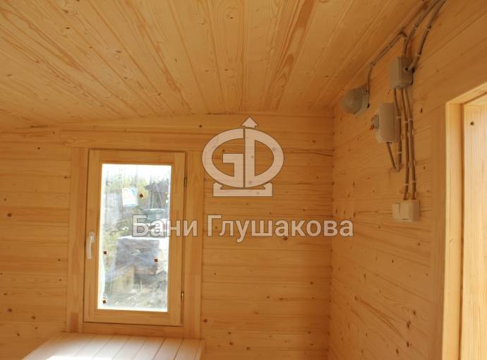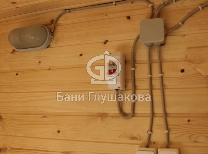 Входит в стоимость. Включает светильники в каждом помещении, вводный автомат, негорючий провод в парную, розетка в комнате отдыха (в банях-бочках розетка устанавливается по требованию).
